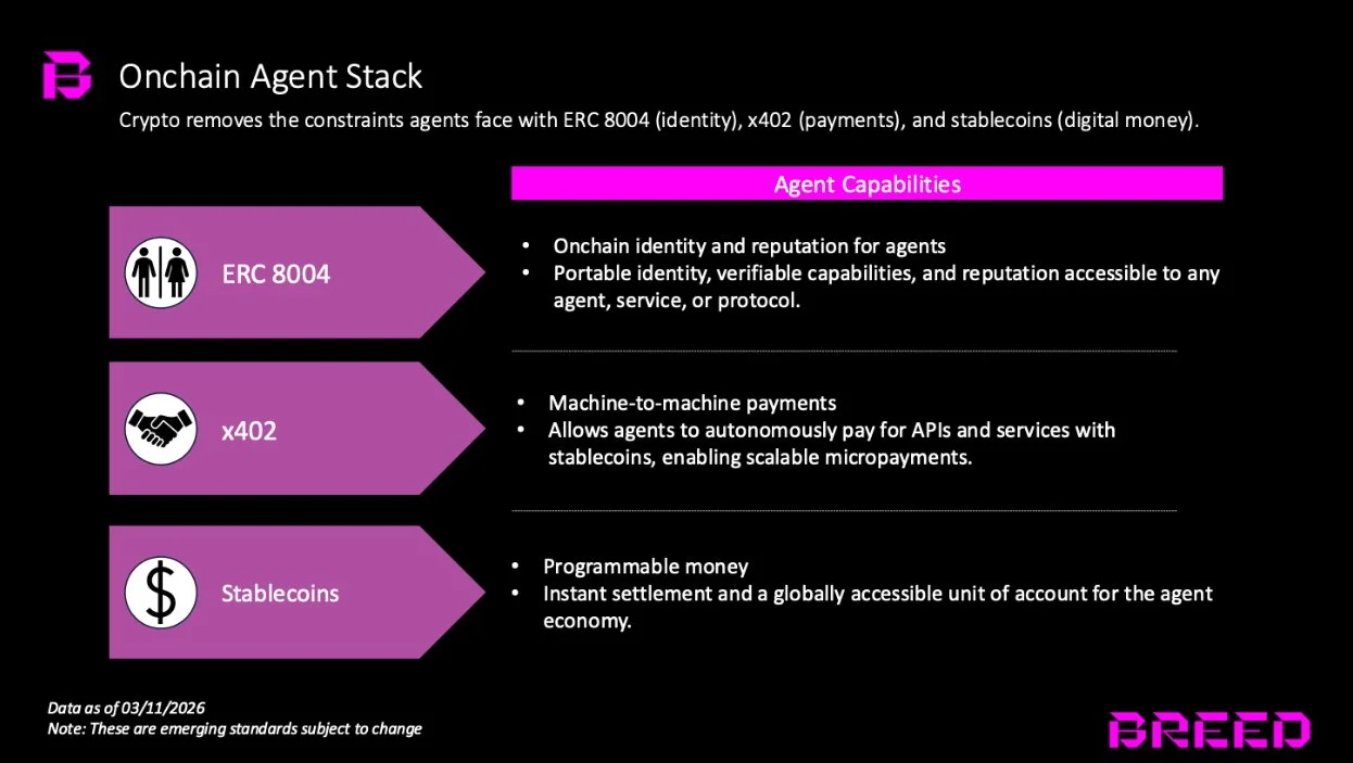 Blockchains solve these constraints with the combination of ERC 8004, x402, and stablecoins.